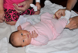 She was 10 lbs, 7 oz and 21 inches of perfect baby girl. She gave us a bit of a scare, because she wasn't breathing very well when she was first born. Turns out she just had some extra amniotic fluid in her lungs and stomach that she needed to get out, but they took her to the nursery for the first few hours of her life to monitor her and check everything out. She quickly rebounded and is perfectly fine now. Here she is getting ready to go home, with Big Sister supervising.